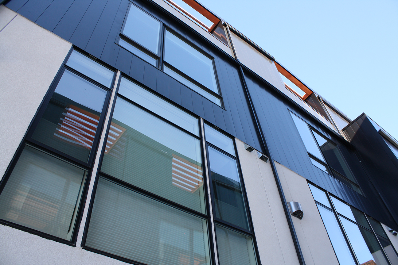 Each of the new 1,830 SF townhomes features a modern exterior with stucco, metal panels, masonry and significant quantities of glass. The interiors feature three bedrooms, three-and-a half bathrooms and a garage. The third bedroom offers a private entryway and the fourth floor features a pergola-covered rooftop deck.