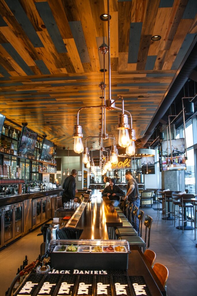 The scope of work included installation of a commercial kitchen, brewery, 3 bars, dining areas, restrooms, and 2 terrace decks. Scope includes local beetle kill, floating ceilings & benches, modern industrial light fixtures, metal fabrications, 40 TVs, and authentic local art. Outdoor seating areas were built including terraces with fire pits, custom planters, string lighting and with featured views of the Rocky Mountains and the kinetic “Field of Air” sculpture.